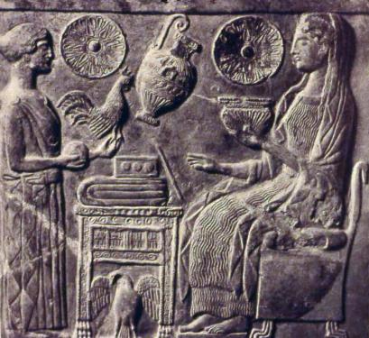 In Southern Italy the goose is one of the sacred animals of Persephone and often found accompanying her, as we see in this pinax from Lokroi Epizephyrii which depicts a maiden offering a rooster to the enthroned goddess while a goose flexes its wings beneath the offering table: