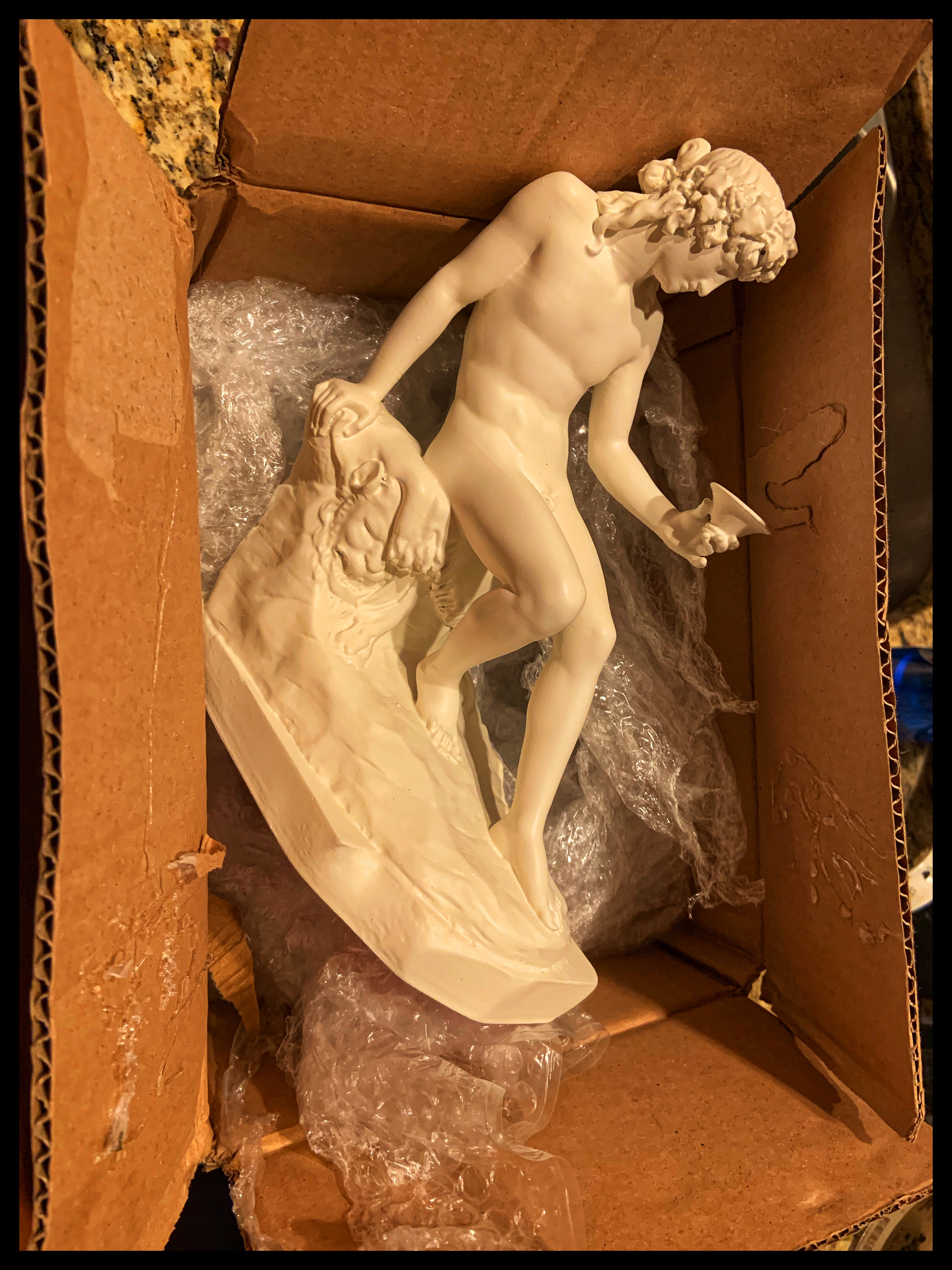 A while back Galina was doing some browsing on Etsy when this statue of Dionysos caught my eye. I am very difficult to shop for, so when I showed interest she jumped on the opportunity to gift me something special. Honestly, it’s been a while so I kind of forgot all about it until the box arrived on our doorstep just as we were going out for a rambling walk through our city on this first night of Anthesteria, which she has posted about here. Later tonight he will be formally installed in my temple space – either as part of the Starry Bull shrine or the one for the Retinue. (I don’t think he fits in with the other shrines, to Dionysos Bakcheios and Lusios respectively, or the Green Way station where I keep all of my φαρμακεία accouterments under his watchful eye. But I’ll feel things out and probably divine before beginning the installation ceremony.) Regardless I think he will make a wonderful addition to the Bakcheion and I take his arrival on Pithoigia of all days as a most favorable omen.